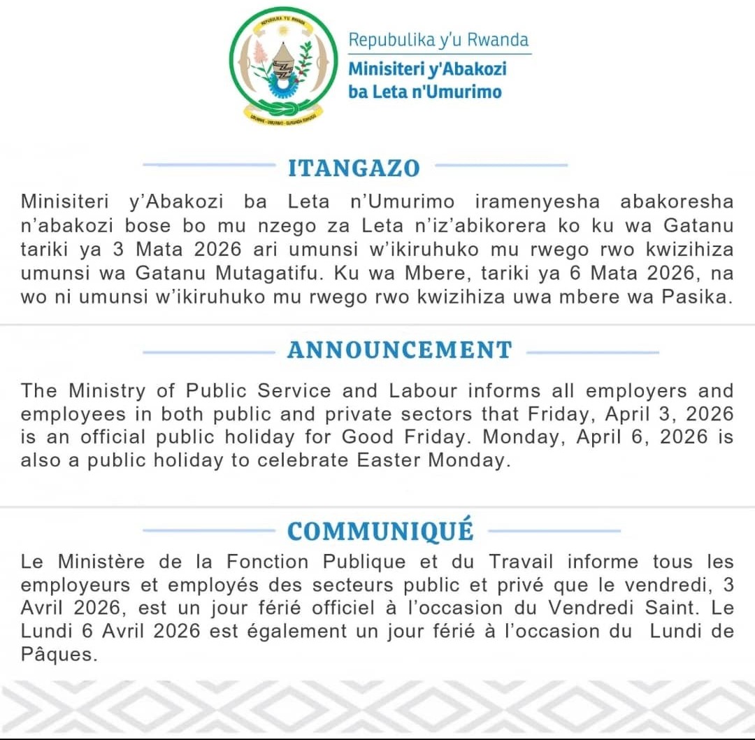 Guhera kuri uyu wa Gatanu tariki ya 3 Mata 2026, abakozi ba Leta n’abikorera bahawe ikiruhuko cy’iminsi mikuru, aho hizihijwe Uwa gatanu mutagatifu (Good Friday) ndetse n’uwa mbere wa Pasika (Easter Monday).