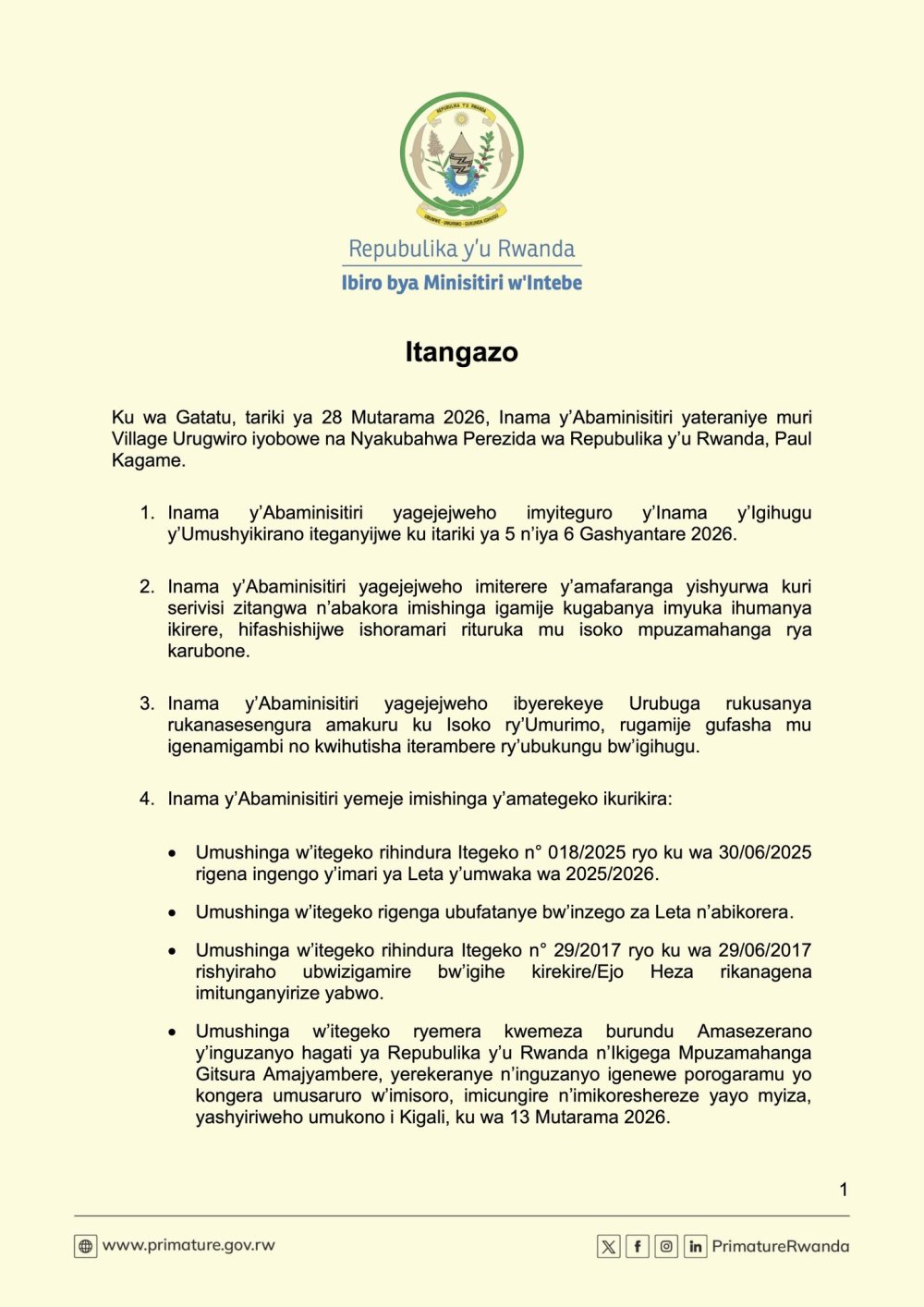 1. Inama y’Abaminisitiri yagejejweho imyiteguro y’lnama y’lgihugu y’Umushyikirano iteganyijwe ku itariki ya 5 n’iya 6 Gashyantare 2026.