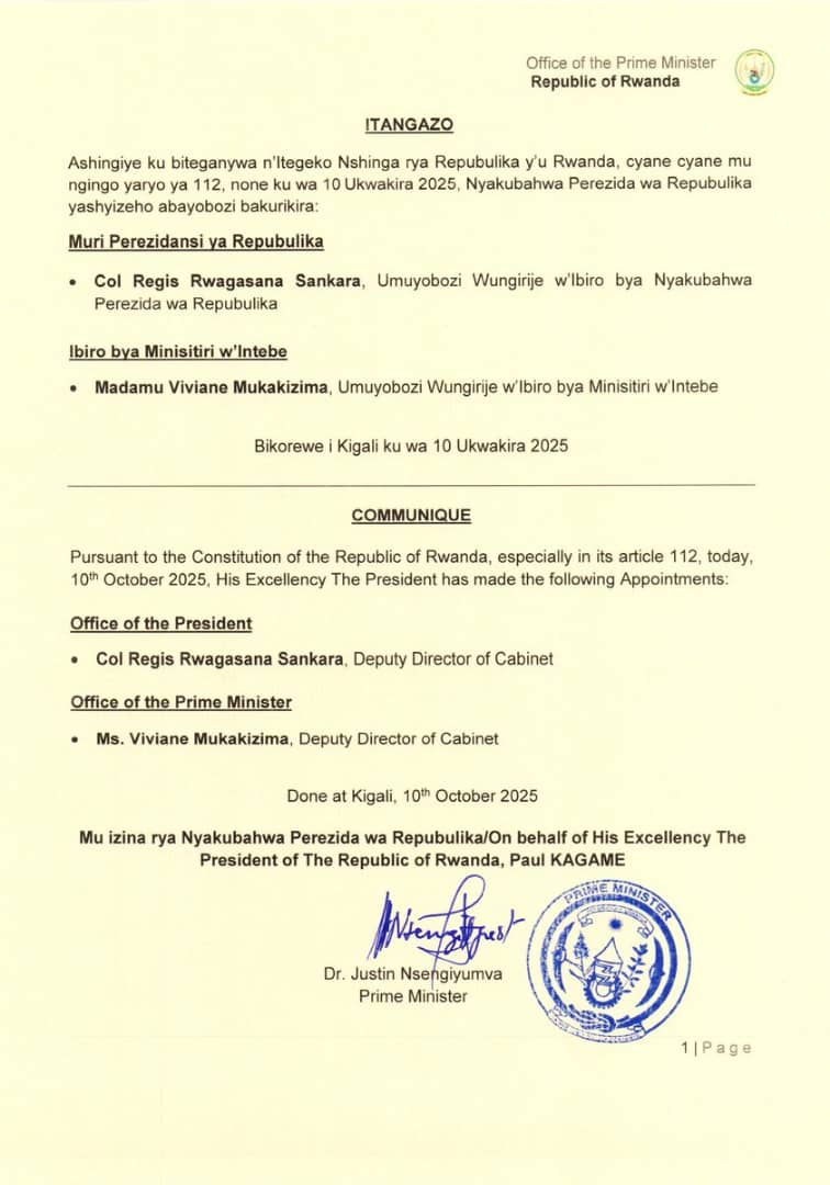 Perezida wa Repubulika y’u Rwanda,Paul Kagame, yashyizeho abayobozi bashya mu nzego ebyiri zikomeye za Leta, ari zo Perezidansi ya Repubulika n’Ibiro bya Minisitiri w’Intebe, nk’uko byatangajwe n’Itangazo ryasohowe n’Ibiro rya Minisitiri w’Intebe kuri uyu wa 10 Ukwakira 2025.