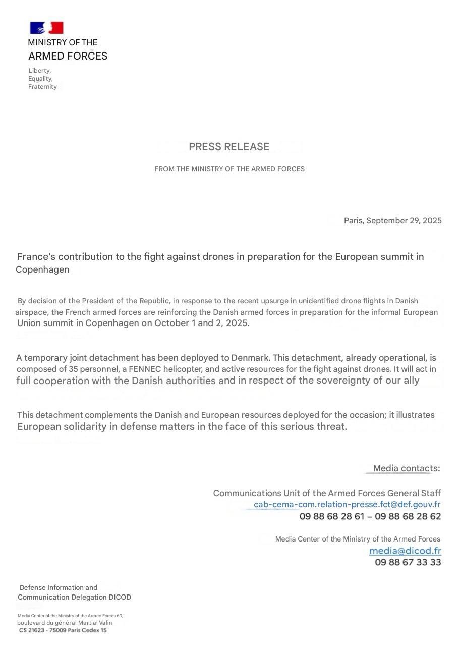 Guverinoma y’u Bufaransa yatangaje ko igiye kohereza abasirikare n’ibikoresho byihariye mu gihugu cya Denmark mu rwego rwo gukaza ingamba zo kurwanya indege z’idafite abapilote (drones) zagiye zigaragara mu kirere cy’iki gihugu.
