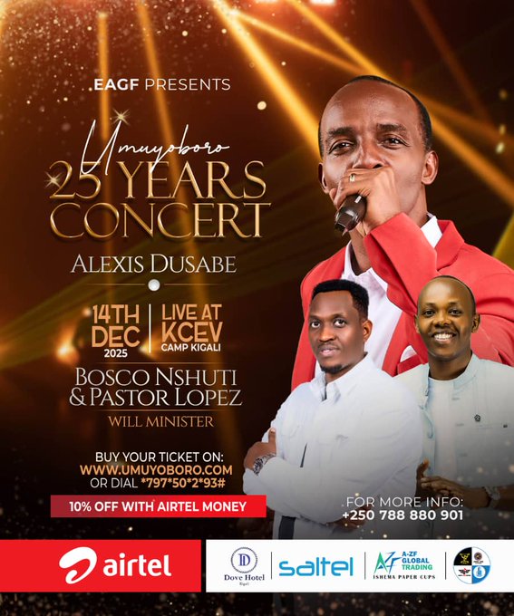 Mu rwego rwo kwizihiza imyaka 25 amaze mu muziki wa Gospel, umuramyi mpuzamahanga Alexis Dusabe yamaze gushyira ku isoko amatike yo kwinjira mu gitaramo gikomeye yateguye, “Umuyoboro 25 Years Concert”, giteganyijwe kuba ku wa 14 Ukuboza 2025 muri KCEV – Camp Kigali. Ni igitaramo cyahariwe gushima Imana, gusubiza amaso inyuma no kwishimira urugendo rurerure rwo gukorera Imana.